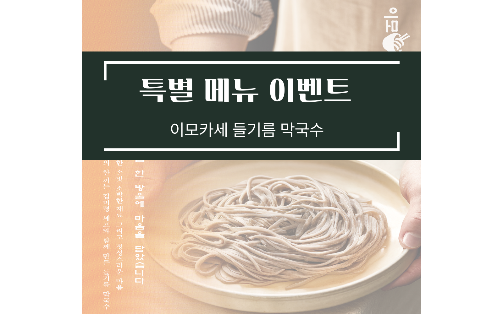 어르신들께 특별한 맛과 즐거움을 선물하기 위해 준비한 셰프 협업 이벤트 소식을 전해드립니다.오는 9월 3일(수), 케어링스테이에서는 많은 분들에게 사랑받는 이모카세 들기름 막국수를 그 맛 그대로 어르신들께 제공해드립니다. ✅김미령 쉐프와 함께 개발한 ‘비법 소스’ 이번 이벤트 메뉴의 핵심은 바로 비법 소스입니다.케어링스테이가 김미령 쉐프와 함께 공동 개발한 소스로, 들기름의 고소함..