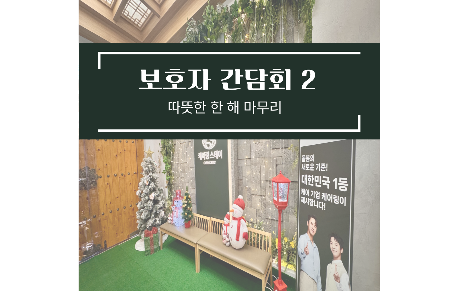 한 해 동안 함께해주신 모든 분들께 감사의 마음을 전합니다안녕하세요, 케어링스테이입니다 2025년이 어느덧 끝자락에 다다랐습니다. 케어링스테이는 올 한 해 동안 어르신과 보호자님들께서 보내주신 믿음과 응원에 진심으로 감사드리는 마음으로 연말 송년회 및 보호자 간담회를 준비했습니다. 한 해 동안 함께한 시간들을 되돌아보고, 또 새로운 한 해를 따뜻하게 맞이하기 위해 마련한 자리이오니 귀한 발걸음으로 함께해주시면 감사하겠습니다.